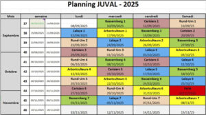 Nous vous communiquons le planning 2025 de Juval, l’atelier inter-association de jus de pomme. Merci d’en prendre note et comme chaque année, Rund Um y animera plusieurs séances de pressage, au cours desquelles nous avons besoin de renfort, alors, n’hésitez pas à vous manifester auprès de Fred ou via le mail contact@rund-um-dieffenbach. org